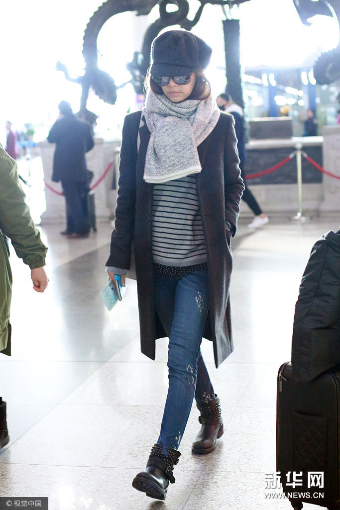 林心如報(bào)童帽黑色大衣鉚釘靴 知性?xún)?yōu)雅
