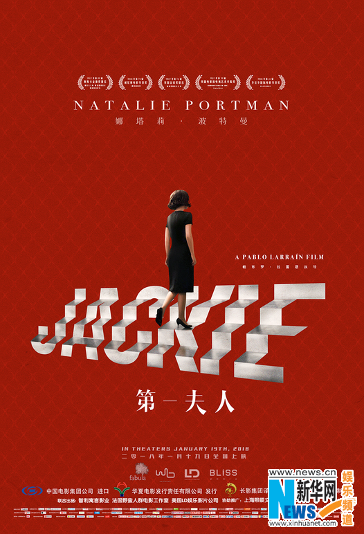 此次曝光的海報巧妙喻示了肯尼迪遇刺后總統夫人杰奎琳的人物心理狀態(tài)。海報中由娜塔莉·波特曼,在由自己名字組成的階梯上艱難攀登,一席黑色連身裙整潔樸素,在鮮紅色的背景中顯得孤獨神秘,同時也暗藏危機,雖背影示人,但讀出了優(yōu)雅自信,似乎已放下內心的秘密與束縛,坦然面對命運帶來的一切。