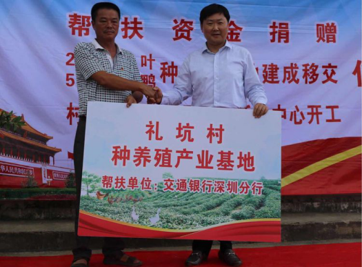 當(dāng)日,交通銀行深圳分行籌劃建設(shè)的茶山、種養(yǎng)殖基地、新一批雞苗和2017年度專(zhuān)項(xiàng)扶貧資金正式移交和撥付給禮坑村,并舉行了村民文化廣場(chǎng)開(kāi)工奠基典禮。陳隃表示,交行深圳分行把幫扶禮坑村做為落實(shí)黨的政策的重點(diǎn)工作,做為國(guó)有銀行承擔(dān)政治責(zé)任、社會(huì)責(zé)任的重要出發(fā)點(diǎn),做為加強(qiáng)黨的建設(shè)的重要抓手,下一步圍繞三個(gè)轉(zhuǎn)變繼續(xù)深化扶貧工作,一是工作目標(biāo)轉(zhuǎn)向社會(huì)主義新農(nóng)村建設(shè),努力將禮坑村建設(shè)成新農(nóng)村建設(shè)示范村中的示范點(diǎn);二是工作方法從貧困戶脫貧向產(chǎn)業(yè)脫貧轉(zhuǎn)變,繼續(xù)發(fā)掘新項(xiàng)目,形成更加持續(xù)化的產(chǎn)值和收益;三是在制度建設(shè)上下功夫,強(qiáng)化社會(huì)主義新農(nóng)村建設(shè)的制度先行和制度示范。