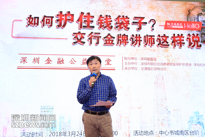 3月24日,在深圳中心書城南臺(tái)階,由深圳銀監(jiān)局指導(dǎo),深圳新聞網(wǎng)、深圳市銀行業(yè)消費(fèi)者權(quán)益保護(hù)促進(jìn)會(huì)主辦,交通銀行深圳分行承辦的大型系列公益活動(dòng)“深圳金融公益講堂”第四講如期開講?;顒?dòng)邀請(qǐng)了來自交通銀行深圳分行的三位金牌講師從專業(yè)角度為市民朋友們?cè)敿?xì)講解理財(cái)知識(shí),現(xiàn)場(chǎng)解答市民的金融消費(fèi)困惑。