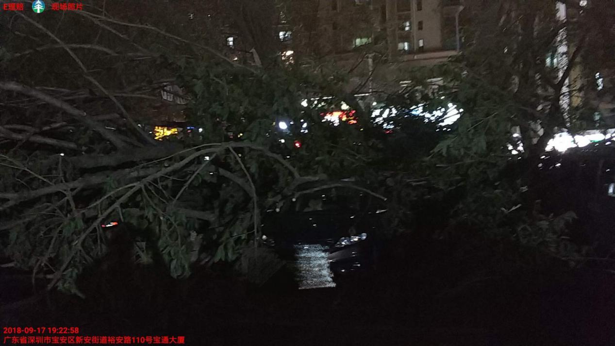 坐標寶安,17日晚,95589接到客戶報案車輛被大樹壓砸,接到報案后查勘員3分鐘內聯系客戶,指引理賠手續(xù)。15分鐘內到達現場。指引客戶到太平財險合作車行進行維修。