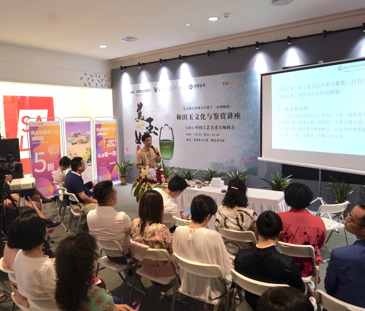 深圳新聞網(wǎng)7月5日訊(記者朱琳 通訊員李昕)7月5日,光大銀行深圳分行聯(lián)合深圳晚報,共同推出中國工藝美術(shù)大師蔣喜“和田玉文化與鑒賞”講座。活動邀請中國工藝美術(shù)大師、中國玉石雕刻大師、國家非物質(zhì)文化遺產(chǎn)(蘇州玉雕)代表性傳承人、研究員級高級工藝美術(shù)師蔣喜先生,向光大銀行的VIP客戶及市民,剖析和田玉文化的價值,傳授和田玉的鑒賞方法,弘揚中華傳統(tǒng)文化。