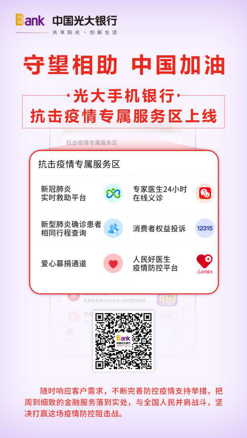 其中,專家醫(yī)生24小時在線義診是由光大銀行與平安好醫(yī)生APP合作推出,可在線免費提供專家醫(yī)生義診服務,并提供多類常見藥物的購買服務;新冠肺炎實時救助平臺是由光大銀行與微醫(yī)互聯(lián)網(wǎng)總醫(yī)院聯(lián)合上線,平臺可提供最新疫情動態(tài)、疫情防御、7*24小時在線免費專業(yè)醫(yī)生咨詢等功能;愛心募捐通道提供多個渠道的賑災捐款項目,讓愛心匯聚防控疫情斗爭第一線;人民好醫(yī)生疫情防控中央平臺第一時間科普權威知識,公布疫情防護物資供需發(fā)布;確診患者相同行程查詢功能可為客戶提供火車車次、飛機航班號、城市等方式,查看是否有肺炎患者同行。