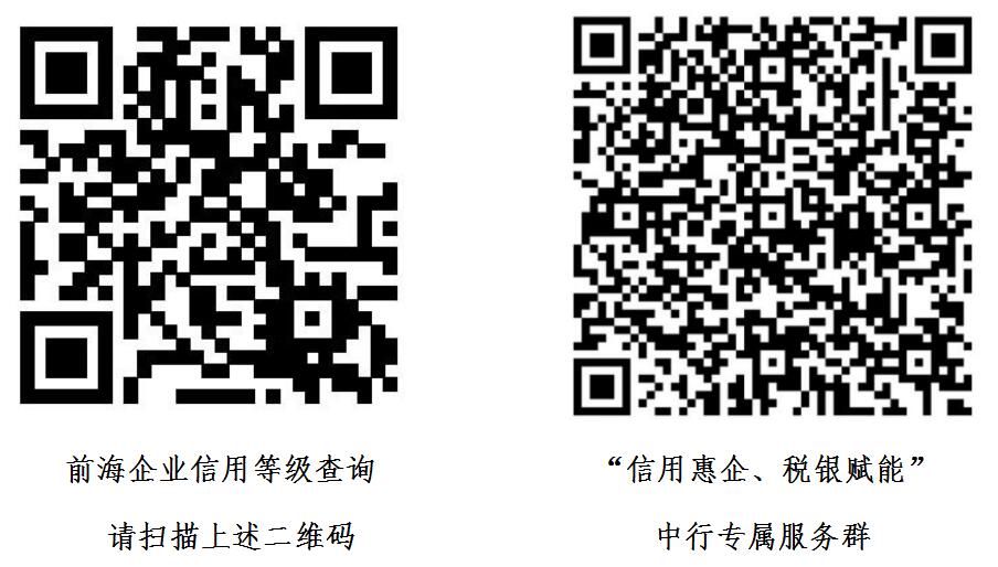 前海注冊(cè)企業(yè)可通過下左二維碼查詢前海信用等級(jí),可通過下右二維碼加入“信用惠企、稅銀賦能”中行專屬服務(wù)群(入群請(qǐng)備注企業(yè)名稱),了解咨詢深圳中行針對(duì)前?!氨趟{(lán)企業(yè)”和“湛藍(lán)企業(yè)”的十項(xiàng)具體服務(wù)內(nèi)容。(黃璜)