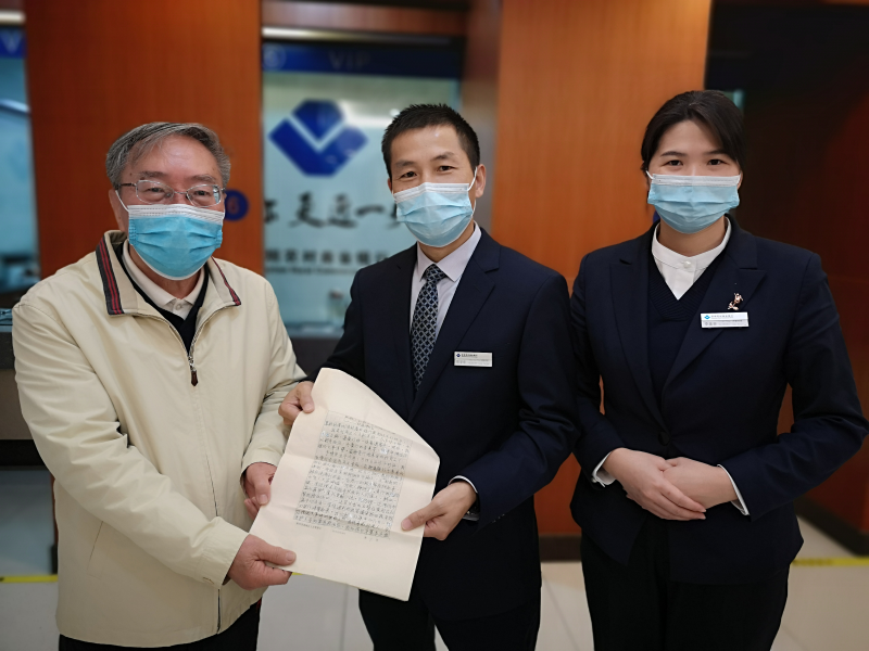 李振煌老人把手寫的感謝信送到深圳農(nóng)商行兩位員工手中