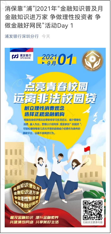 9月1日,也是校園開學(xué)的日子。開學(xué)的第一天,浦發(fā)銀行深圳分行特別推出“點(diǎn)亮青春校園遠(yuǎn)離非法校園貸”日歷宣傳海報(bào),并在官方微信公眾號(hào)進(jìn)行轉(zhuǎn)發(fā)宣傳,同時(shí)在46家網(wǎng)點(diǎn)營(yíng)業(yè)大廳顯示屏播放,重點(diǎn)傳播校園貸金融知識(shí),提醒學(xué)生人群,合理消費(fèi),遠(yuǎn)離不良網(wǎng)貸行為。據(jù)悉,該行將在九月每個(gè)工作日持續(xù)發(fā)布消保宣傳日歷,常態(tài)化長(zhǎng)效推進(jìn)金融知識(shí)普及月宣傳活動(dòng)的開展。