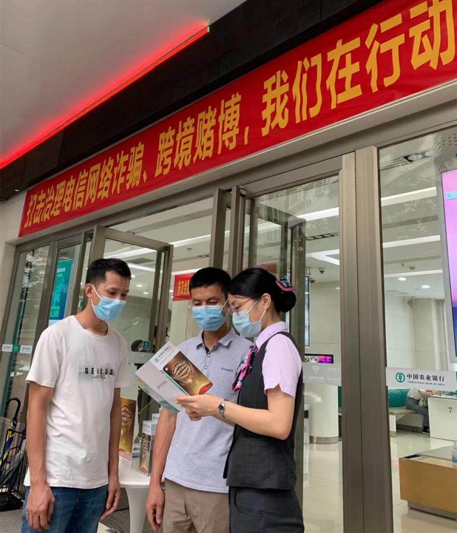 農(nóng)行深圳分行以點(diǎn)帶面,發(fā)揮銀行網(wǎng)點(diǎn)宣傳陣地的優(yōu)勢,員工向前來辦理業(yè)務(wù)的群眾普及基本防騙知識(shí),進(jìn)一步提升防騙宣傳的影響力和覆蓋面。張貼“反詐拒賭,安全支付”等警示語橫幅、醒目區(qū)域擺放金融安全知識(shí)學(xué)習(xí)海報(bào)、向到訪客戶派發(fā)防金融詐騙宣傳折頁、協(xié)助客戶下載注冊(cè)“國家反詐中心”APP、網(wǎng)點(diǎn)現(xiàn)場開展金融反詐宣講會(huì)等一系列宣傳工作有序地、滲透式地在農(nóng)行各大網(wǎng)點(diǎn)開展著,成為提升全民金融風(fēng)險(xiǎn)防范意識(shí)教育的重要抓手。