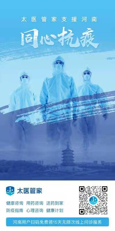 近日,河南地區(qū)出現(xiàn)多起疫情病例,為支援抗疫工作,幫助當(dāng)?shù)鼐用褡龊媒】倒芾?,增?qiáng)抗疫信心,太?;ヂ?lián)網(wǎng)醫(yī)院——太醫(yī)管家繼向西安市民開放免費線上問診通道后,再次定向河南地區(qū)居民推出在線問診服務(wù)。