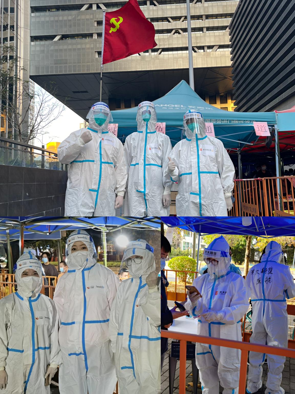 在疫情防控的關(guān)鍵時(shí)期,深圳分行黨委堅(jiān)決貫徹落實(shí)當(dāng)?shù)卣姆揽匾螅中悬h委書記、行長(zhǎng)韓學(xué)智同志緊急召開(kāi)黨委會(huì)議,啟動(dòng)應(yīng)急預(yù)案,積極部署并投入疫情防控工作,確保日常營(yíng)運(yùn)和客戶服務(wù)等工作有序運(yùn)轉(zhuǎn)。在深圳福田區(qū)金融工作局的組織與號(hào)召下,分行黨委要求全體黨員干部發(fā)揮先鋒模范作用,主動(dòng)為社區(qū)疫情防控工作提供志愿服務(wù)。分行黨委委員們率先垂范,分頭帶領(lǐng)黨員干部奔赴社區(qū)慰問(wèn)抗戰(zhàn)一線工作人員,并犧牲周末休息時(shí)間深入社區(qū)核酸采樣點(diǎn),脫下西裝變身“大白”。深圳分行各黨支部和團(tuán)支部先后組織開(kāi)展各類志愿服務(wù)累計(jì)時(shí)長(zhǎng)超過(guò)100小時(shí),活躍在防疫抗疫一線的同志們?cè)谌ΡU蠌V大群眾金融服務(wù)需求的同時(shí),和醫(yī)護(hù)工作者一同守護(hù)著千家萬(wàn)戶。作為集團(tuán)駐深企業(yè)協(xié)同工作的牽頭單位,分行牽頭組建駐深企業(yè)志愿者先鋒隊(duì),緊急投身福田區(qū)抗擊疫情的各個(gè)戰(zhàn)線和各個(gè)角落,不分晝夜、不論疲倦、以實(shí)際行動(dòng)踐行初心、使命和擔(dān)當(dāng),弘揚(yáng)新時(shí)代共產(chǎn)黨人的奉獻(xiàn)精神?!叭绻皇怯H身體驗(yàn)志愿者服務(wù)工作,永遠(yuǎn)不知道抗疫人員的工作是如此辛苦!有多少人在負(fù)重前行才確保了深圳市民有序和安寧的生活。此刻很想擁抱可親可敬的你們,防護(hù)服雖然阻擋了我們的擁抱,但無(wú)法阻擋我們一起抗擊疫情的心?!币晃恢驹刚哌@樣記錄到。