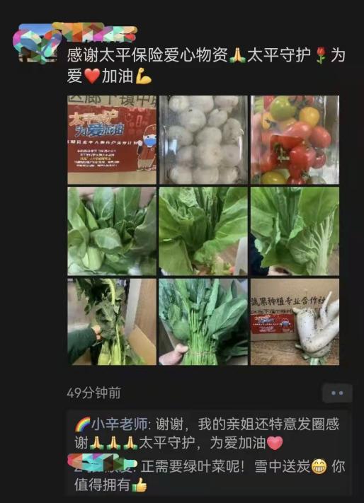 為積極應(yīng)對疫情,太平人壽上海分公司迅速反應(yīng),推出“太平守滬為愛加油”客戶關(guān)愛計劃。公司與滬上知名果蔬種植基地合作,將新鮮采摘的蔬果,由持有48小時內(nèi)核酸陰性證明的太平保險代理人,為客戶朋友直線送達(dá)。