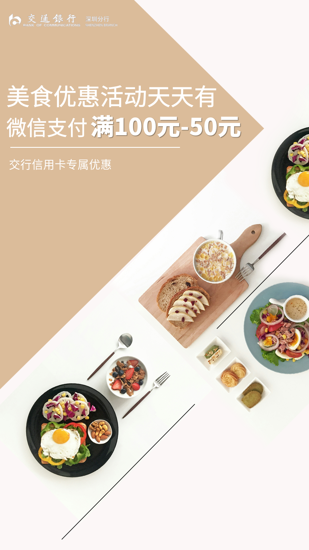 活動(dòng)內(nèi)容:交通銀行深圳地區(qū)持卡客戶(借記卡或信用卡),在指定餐飲品牌門店線下消費(fèi),使用微信支付(綁定交行卡),有機(jī)會(huì)享受滿100元減50元優(yōu)惠(最高減50元),每人每月最高享兩次機(jī)會(huì),名額有限,先到先得。