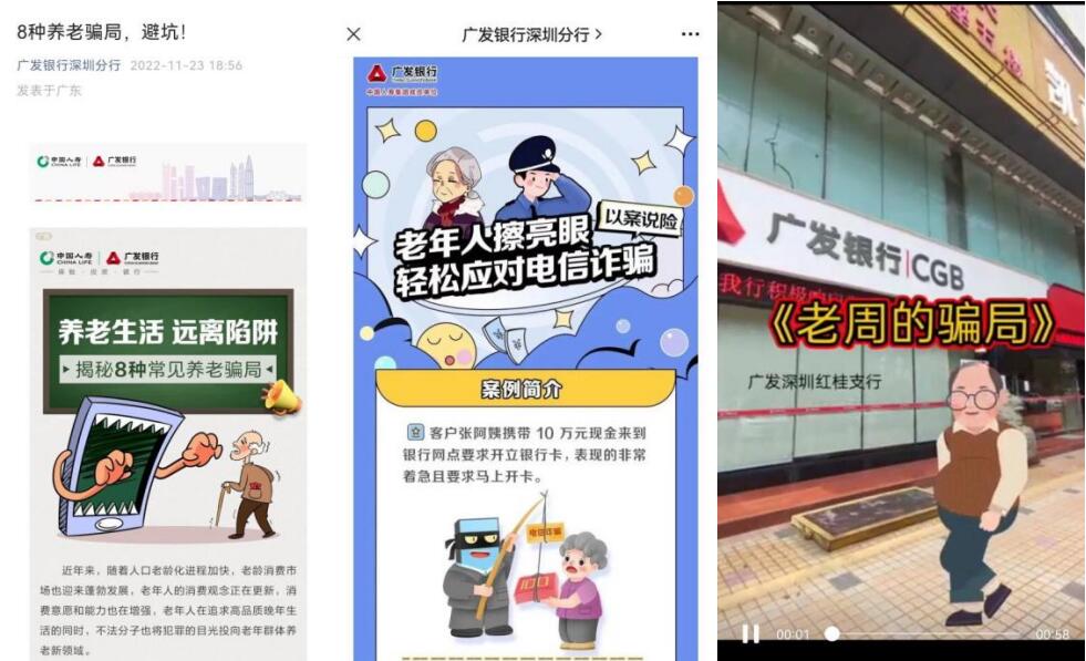 廣發(fā)銀行深圳分行積極運(yùn)用數(shù)字科技與新媒體宣傳相結(jié)合,通過發(fā)動(dòng)全行開展寓教于樂的短視頻大賽方式來宣傳金融知識,提高老年人防范養(yǎng)老詐騙意識;通過分行微信公眾號發(fā)送防范非法集資、防范養(yǎng)老詐騙等宣傳軟文;加強(qiáng)對打著科技創(chuàng)新、綠色轉(zhuǎn)型等政策旗號,利用元宇宙、NFT等新概念的新業(yè)態(tài)新形態(tài)等非法集資活動(dòng)進(jìn)行風(fēng)險(xiǎn)提示。