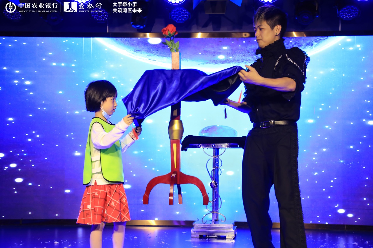 在騎鯨劇場里,奇幻魔術(shù)秀環(huán)節(jié),來自農(nóng)業(yè)銀行的小朋友被抽中上臺,與魔術(shù)師共同感受魔術(shù)的魅力。