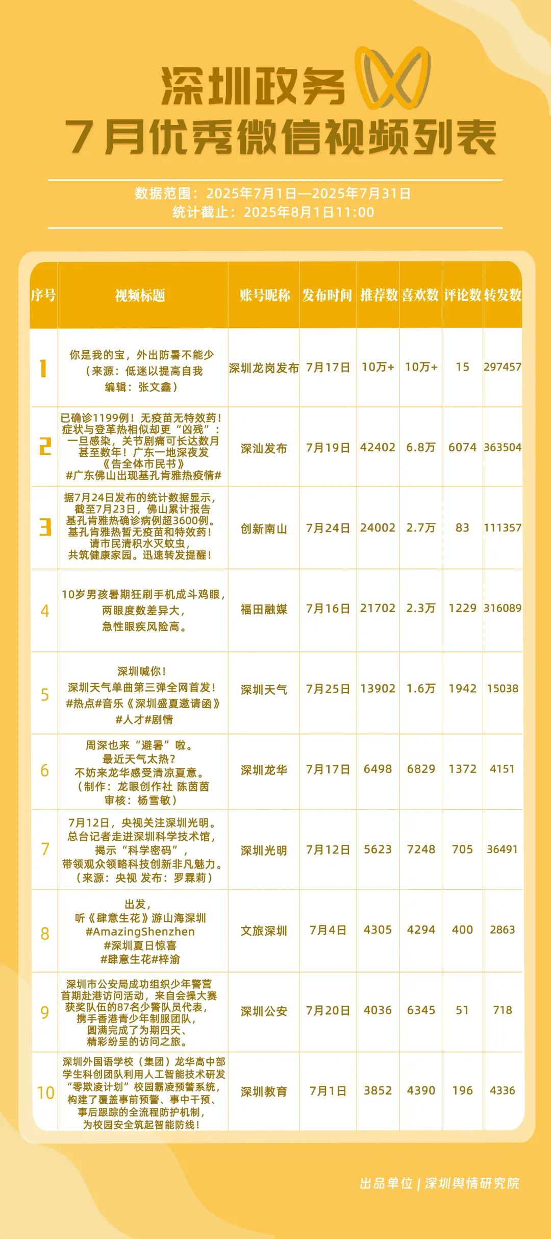 7月,“深圳天氣”“DOU愛(ài)龍華”“深圳魅力福田”“深汕發(fā)布”“掌上龍崗”“創(chuàng)新南山”“深圳交警”“文旅深圳”“深圳衛(wèi)健委”“深圳普法”共10個(gè)政務(wù)抖音號(hào)獲得“優(yōu)秀政務(wù)抖音號(hào)”稱號(hào)。其中,“深圳天氣”互動(dòng)指標(biāo)獲滿分,憑借氣象與趣味相結(jié)合的創(chuàng)新科普形式,領(lǐng)跑優(yōu)秀政務(wù)抖音號(hào);“DOU愛(ài)龍華”“深圳魅力福田”分別位列第二、三名,通過(guò)聚焦網(wǎng)絡(luò)熱點(diǎn)、挖掘創(chuàng)意內(nèi)容,不斷提升傳播效能,展現(xiàn)出強(qiáng)大的政務(wù)新媒體影響力;“深汕發(fā)布”“掌上龍崗”“創(chuàng)新南山”等賬號(hào)緊隨其后,上榜的優(yōu)質(zhì)政務(wù)抖音號(hào)用短視頻語(yǔ)言強(qiáng)化傳播效果,展現(xiàn)了鮮明的賬號(hào)特色和風(fēng)采。