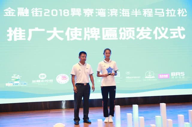 發(fā)布會上,金融街惠州置業(yè)有限公司總經(jīng)理梁成藝代表金融街2018巽寮灣濱海半程馬拉松籌委會給賽事代言人焦安靜頒發(fā)推廣大使牌匾。