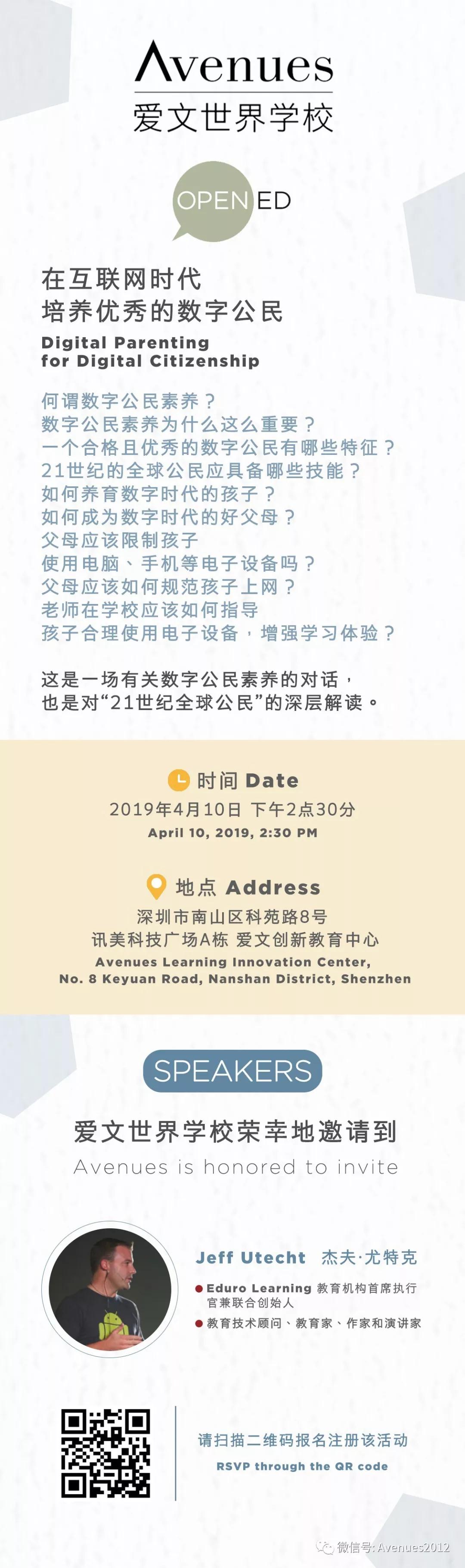 愛(ài)文世界學(xué)校專(zhuān)門(mén)邀請(qǐng)了知名的教育技術(shù)顧問(wèn)、教育家、作家及演講家杰夫?尤特克 (Jeff Utecht),就數(shù)字公民素養(yǎng)話(huà)題進(jìn)行深入探討,從何謂數(shù)字公民素養(yǎng),到數(shù)字公民素養(yǎng)的重要性,再到父母和老師如何培養(yǎng)孩子成為一位優(yōu)秀的數(shù)字公民。