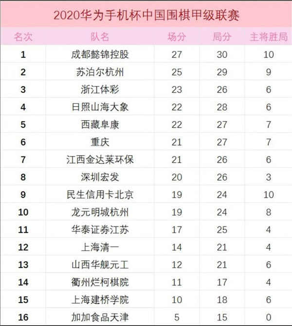本輪其它隊賽果如下:衢州爛柯棋院0:4負西藏阜康;成都懿錦控股3:1勝日照山海大象;上海清一隊3:1勝華泰證券江蘇;民生信用卡北京4:0勝天津加加食品;重慶1:3負蘇泊爾杭州;山西華艦元工4:0勝上海建橋學院;浙江體彩2:2主將負龍元明城杭。