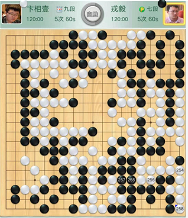 第二臺主將臺,由深圳隊戎毅七段執(zhí)黑對陣江西隊外援卞相壹九段。開局黑取實地白取外勢,局面接近。中盤黑棋在中央放棄出頭花兩手棋吃掉左下角白棋稍小,白棋棄角后圍住中央巨空,白稍好。官子階段白棋左上形狀處理有誤,黑棋未能抓住沖擊機會,選擇大幅退讓,最終目數不夠。戎毅執(zhí)黑負卞相壹。