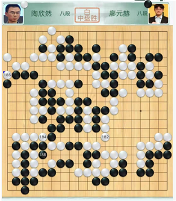 第四臺(tái)慢棋,由深圳隊(duì)陶欣然八段執(zhí)白對(duì)陣成都隊(duì)廖元赫八段。中央戰(zhàn)斗時(shí)候白棋選擇退讓,反倒形成打劫,黑棋劫勝后大幅領(lǐng)先。之后黑棋官子階段不夠冷靜細(xì)膩,幾處小虧損之后被白反超。黑棋看到局面危險(xiǎn)更加沖動(dòng)的選擇和白棋互相破空,結(jié)果又虧損導(dǎo)致差距越來越大。陶欣然執(zhí)白中盤勝廖元赫。