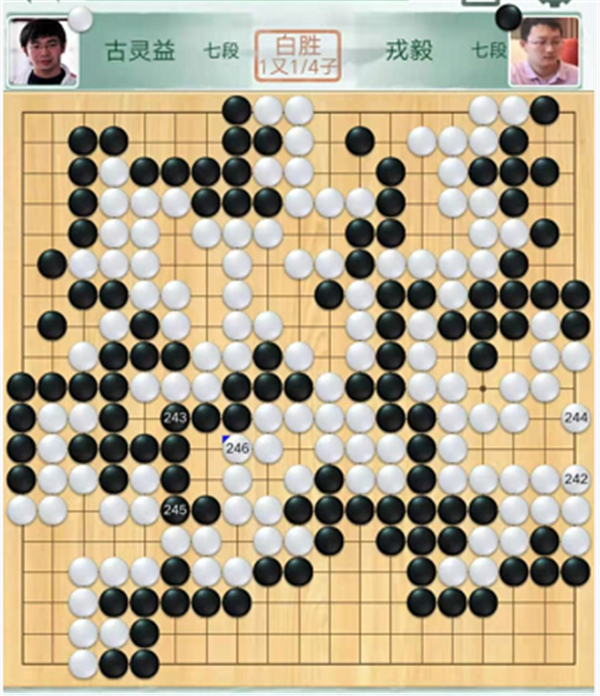 第三臺(tái)快棋,深圳隊(duì)的戎毅七段執(zhí)黑對(duì)陣成都隊(duì)的古靈益七段。黑棋開局采取取地策略。下方黑棋形狀處理保守,子效重復(fù)虧損。之后黑棋一直沒有明顯勝機(jī),最終以1又1/4子落敗。戎毅執(zhí)黑1又1/4子負(fù)古靈益。