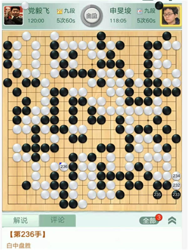 第一臺(tái)慢棋,由深圳隊(duì)的外援申旻埈九段執(zhí)黑對(duì)陣成都隊(duì)的世界冠軍黨毅飛九段。右下角白棋出現(xiàn)失誤,黑棋沒有抓住機(jī)會(huì)反而被白棋便宜不少。之后黑棋頑強(qiáng)追趕局面一度接近。但是官子階段黑棋始終沒有發(fā)現(xiàn)左上角官子便宜的小巧手,被白消除隱患后,白勝勢(shì)。申旻埈執(zhí)黑中盤負(fù)黨毅飛。