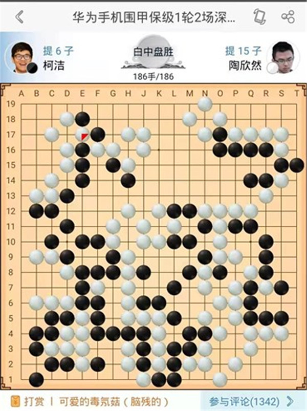 主將臺由深圳隊陶欣然八段執(zhí)白對陣民生隊的柯潔九段。開局右下角黑棋行棋次序錯誤,遭到白棋反擊。黑棋沖動的選擇打劫轉(zhuǎn)換,轉(zhuǎn)換后白棋已經(jīng)勝勢。之后黑棋左邊頑強制造打劫,再次形成轉(zhuǎn)換依然局面大差。之后黑棋又在上邊挑起劫爭,白棋劫材很多,黑認負,陶欣然中盤勝柯潔。陶欣然達成對世界第一人的三連勝。