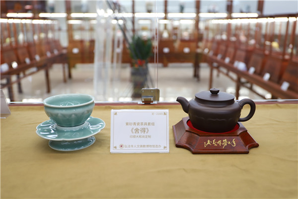 再就是印順大和尚倡意定制的帶有濃厚佛教色彩的生活用具,如紫砂、青瓷茶具套組《舍得》,景德鎮(zhèn)描金茶具“六度”系列《荷順》,均有以佛教意象蓮花為內(nèi)容的圖案或造型,讓人在使用時頓生清靜心、倍感佛法力,或可為信眾修行悟道助一臂之力。