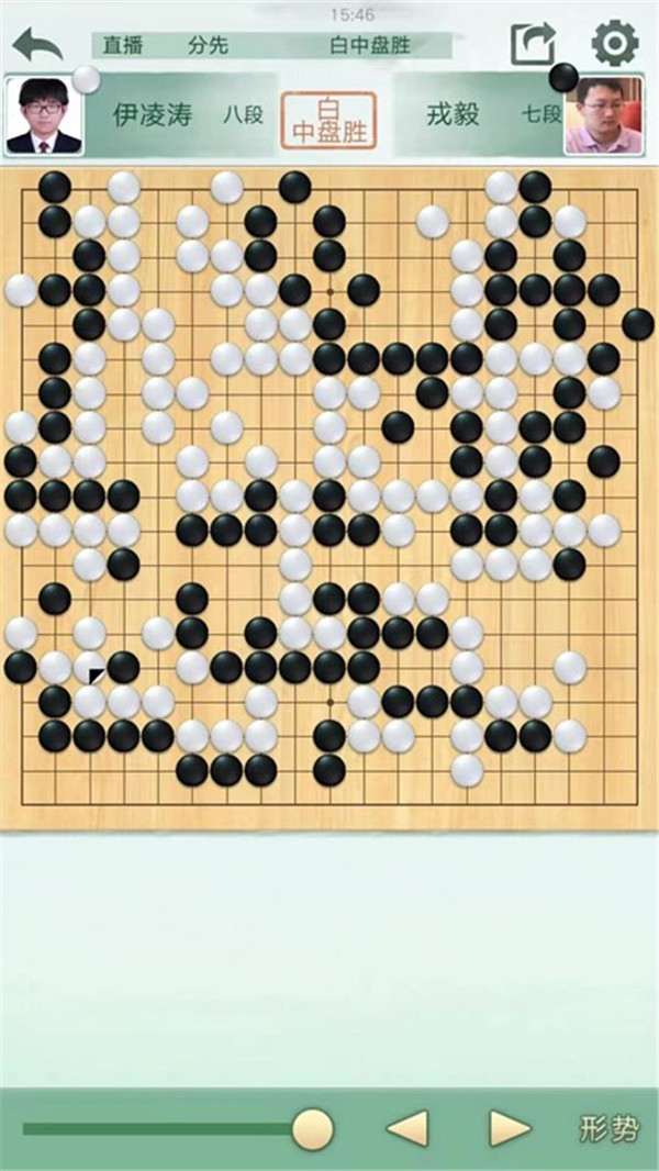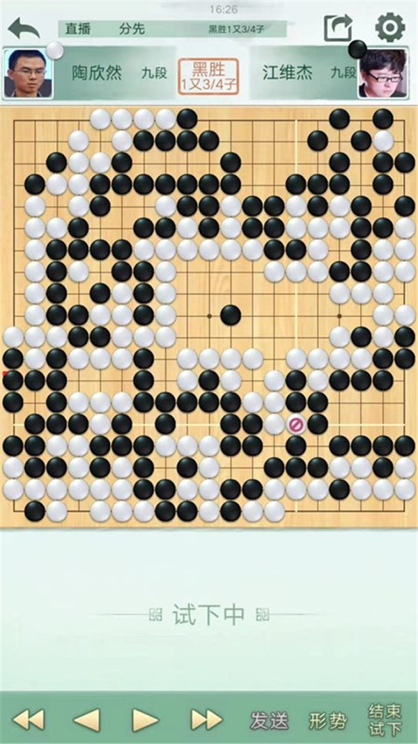 二臺陶欣然執(zhí)白主將對陣世界冠軍江維杰。開局白有利,左邊白棋進攻黑棋時候手法過于松緩,局面接近。之后白棋中央又出現(xiàn)緩手黑棋領(lǐng)先。之后右上白棋主動開劫,但是劫材處理失誤,局面惡化。之后黑棋稍有退讓保持小勝。