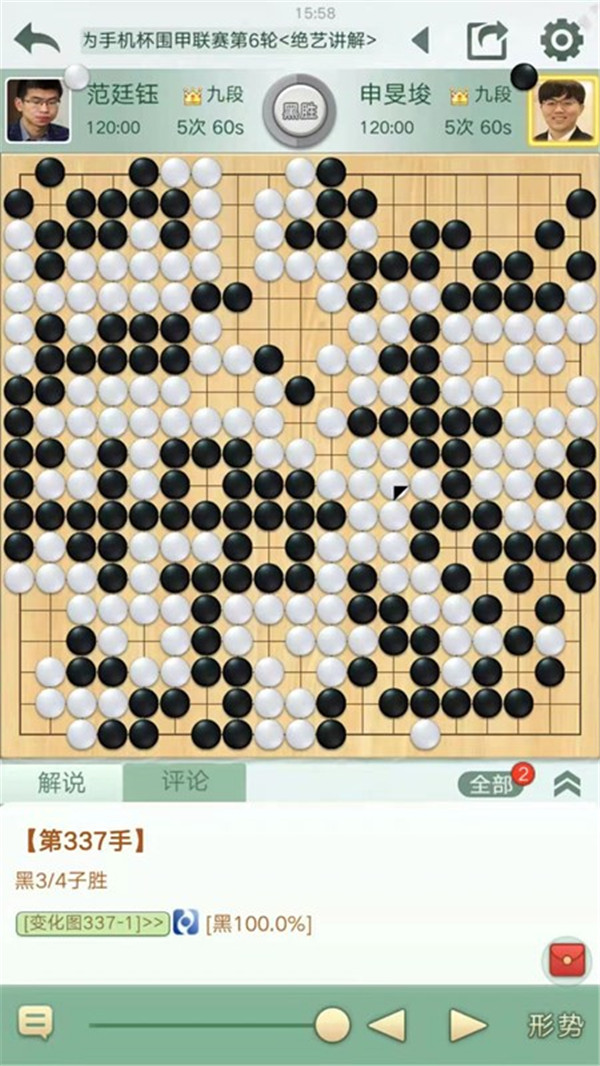 一臺申旻俊執(zhí)黑對陣世界冠軍范廷鈺。開局下邊白棋攻擊手法不當,黑處理好后局面領(lǐng)先。中盤黑棋在左邊計算精準,下出絕妙手段,在白棋空里出棋后優(yōu)勢擴大,之后黑棋穩(wěn)扎穩(wěn)打?qū)?yōu)勢保持至終局獲勝。