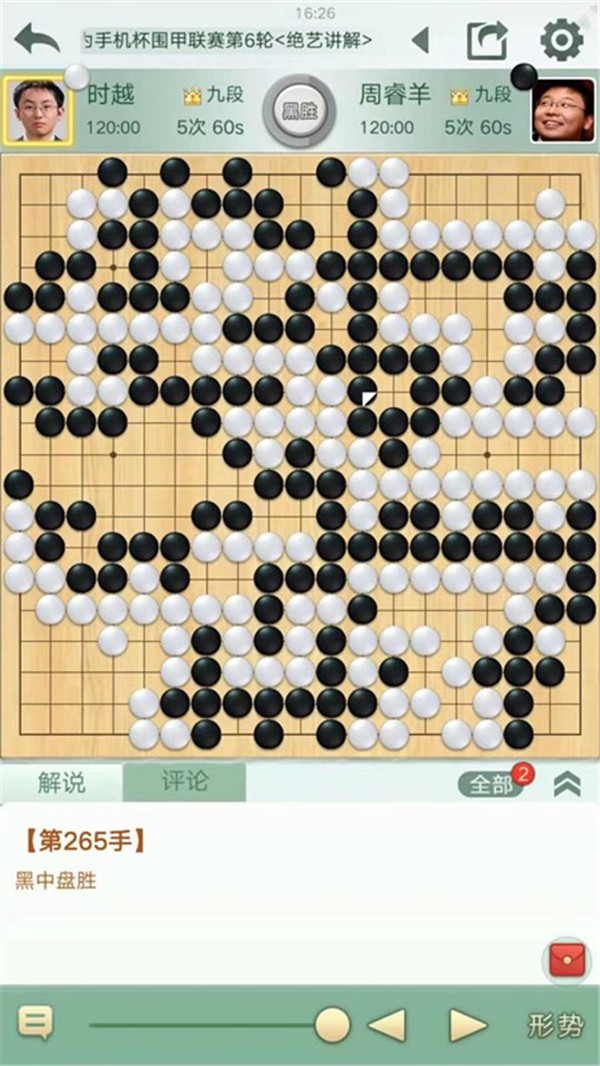 四臺時越執(zhí)白對陣世界冠軍周睿羊。中盤白棋侵消黑棋左上大模樣,黑棋付出很大代價強殺形成打劫。白棋劫爭中不夠細膩沒有擴大戰(zhàn)果而是聯(lián)絡(luò)成活,局面白稍有利。之后白棋左下連續(xù)下出緩手后局面接近。右下角黑棋二路夾試白應(yīng)手時白棋嚴重失誤,被黑棋奪走角地后局勢逆轉(zhuǎn)。