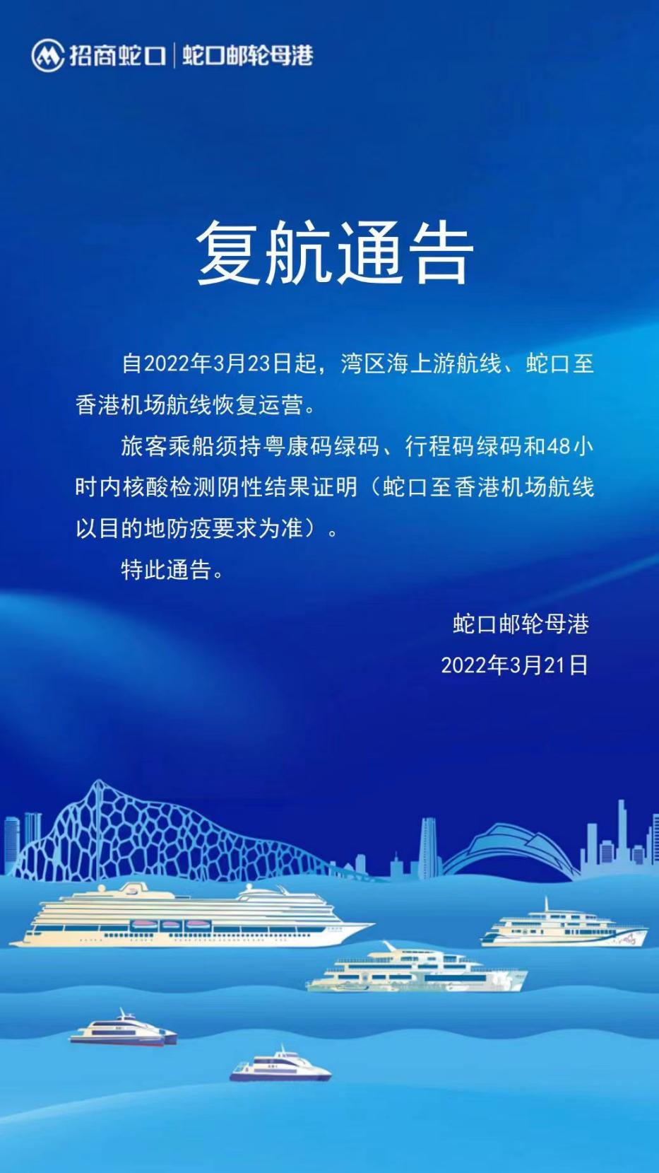 讀特客戶端·深圳新聞網(wǎng)2022年3月21日訊(記者 田志強)記者從招商蛇口郵輪母港獲悉,自3月23日起,灣區(qū)海上游航線、蛇口至香港機場航線恢復運營。旅客須持粵康碼綠碼、行程碼綠碼和48小時內(nèi)核酸檢測陰性結(jié)果證明乘船。