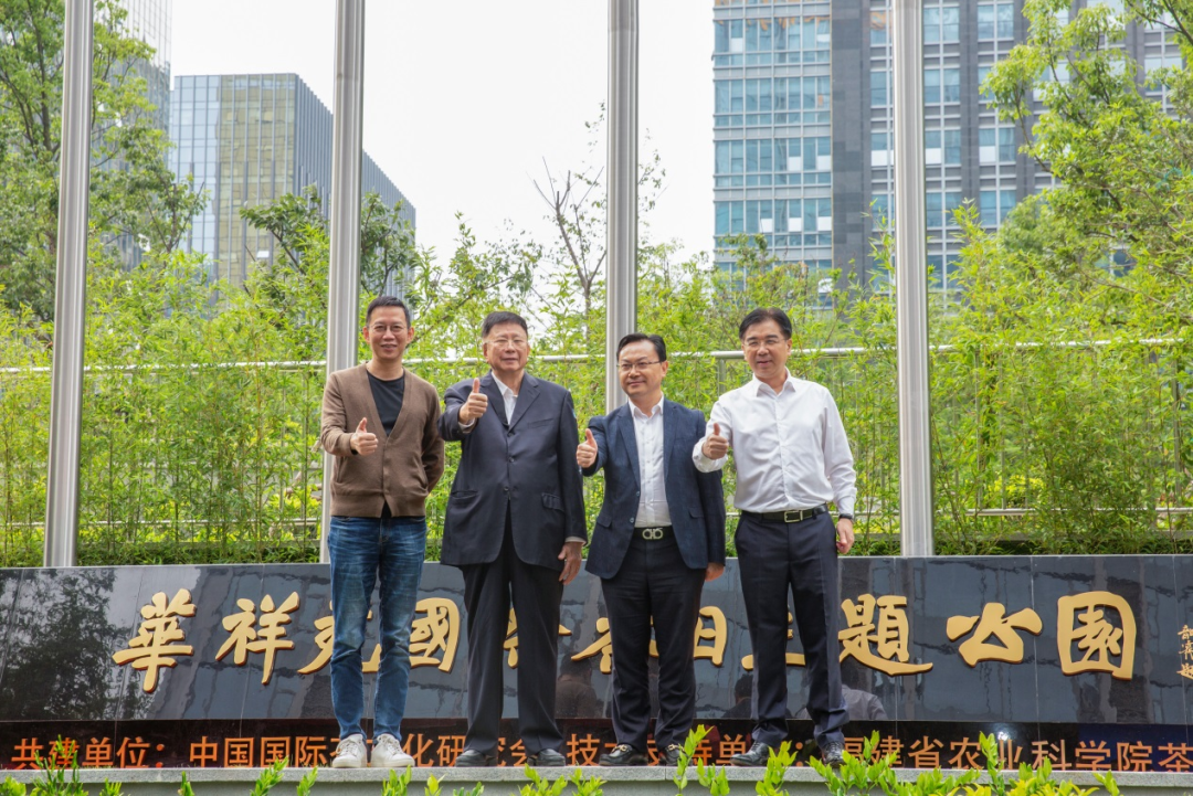 全國(guó)人大常委會(huì)原委員、福建省人大常委會(huì)原副主任、海峽兩岸茶業(yè)交流協(xié)會(huì)高級(jí)顧問(wèn)莊先(左二),中國(guó)工程院院士、湖南農(nóng)業(yè)大學(xué)學(xué)術(shù)委員會(huì)主任劉仲華(右二),著名財(cái)經(jīng)作家、華祥苑國(guó)貨推薦官吳曉波(左一),華祥苑茶業(yè)股份有限公司董事長(zhǎng)肖文華(右一)共同為主題公園開(kāi)園揭幕。為慶賀國(guó)際茶日而建的主題公園——521國(guó)際茶日主題公園,盛大開(kāi)園!世界茶樹(shù)在這里匯聚,華祥苑八大莊園的茶樹(shù)于此展現(xiàn),學(xué)習(xí)堂里有對(duì)中國(guó)茶發(fā)展的殷殷囑托。中國(guó)茶文化的世界坐標(biāo),中國(guó)傳統(tǒng)文化的世界表達(dá),再添新章。