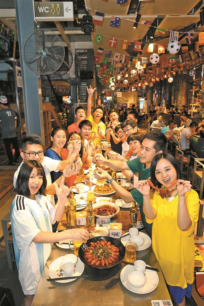 但這次世界杯期間,許女士找到了一個好去處:“看球其實(shí)不重要,重要的是大家聚在一起,但口味一定要找大家都能接受的,所以挑來挑去最后選擇了龍巢?!痹谧蛲淼凝埑驳陜?nèi),一整盤的蛋黃味小龍蝦被許女士吃個精光:“這是吃得最暢快的一次,整個氛圍也很到位,接下來的比賽就扎根在這里了。”