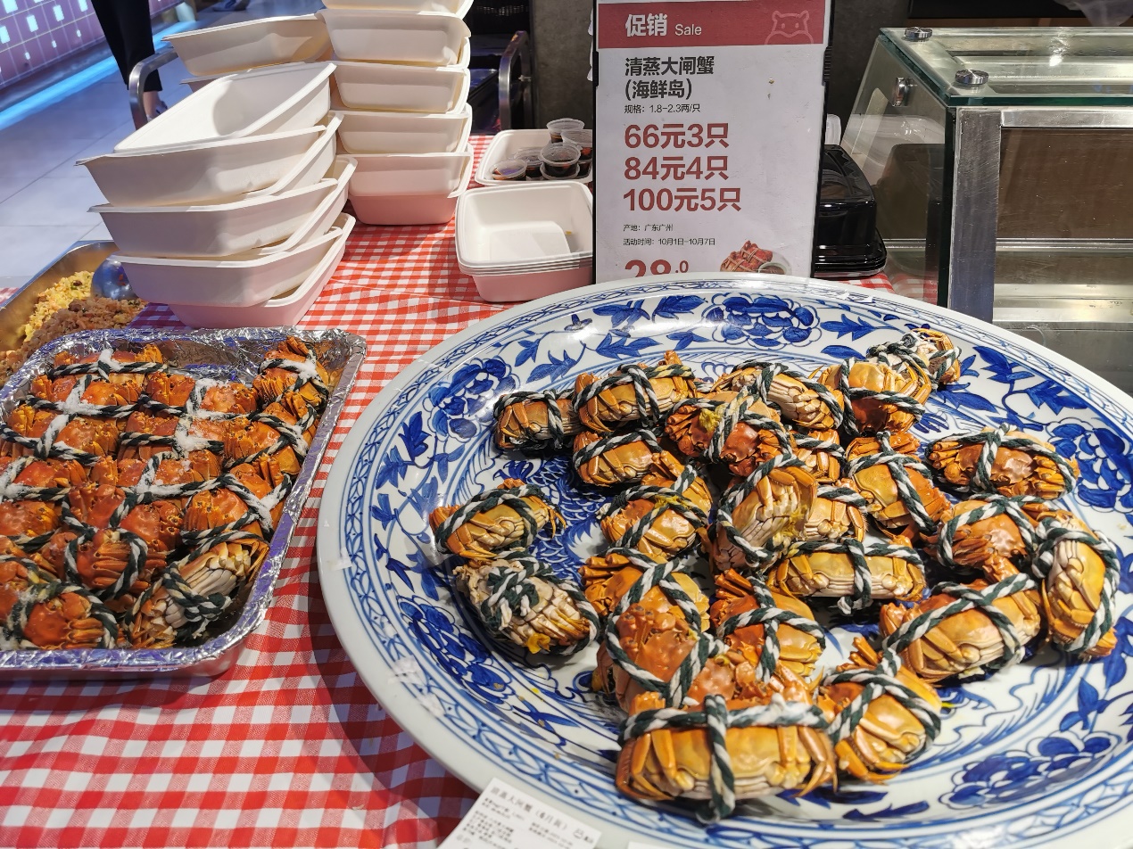 其中爆款非大閘蟹莫屬。民間有個(gè)講究:“九雌十雄”,農(nóng)歷九月吃母的大閘蟹,農(nóng)歷十月吃公的,因?yàn)槟菚r(shí)候大閘蟹的蟹黃和蟹膏是最好的。黃金周期間,盒馬深圳大閘蟹銷量與9月相比增長(zhǎng)六倍。其中最受歡迎的是2兩重的母蟹,盒馬皇庭廣場(chǎng)店假期里試過一天賣出近兩千只大閘蟹。