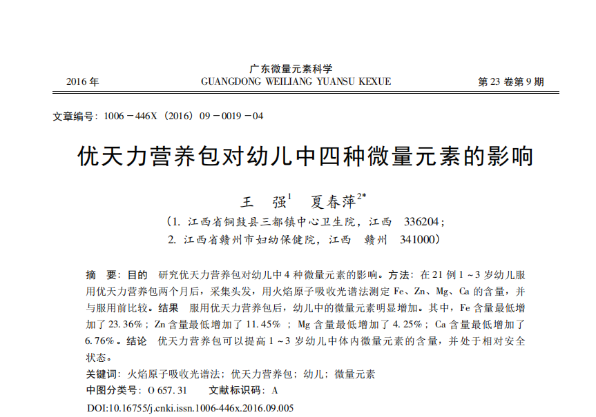 王強,夏春萍.優(yōu)天力營養(yǎng)包對幼兒中四種微量元素的影響[J].廣東微量元素科學(xué),2016