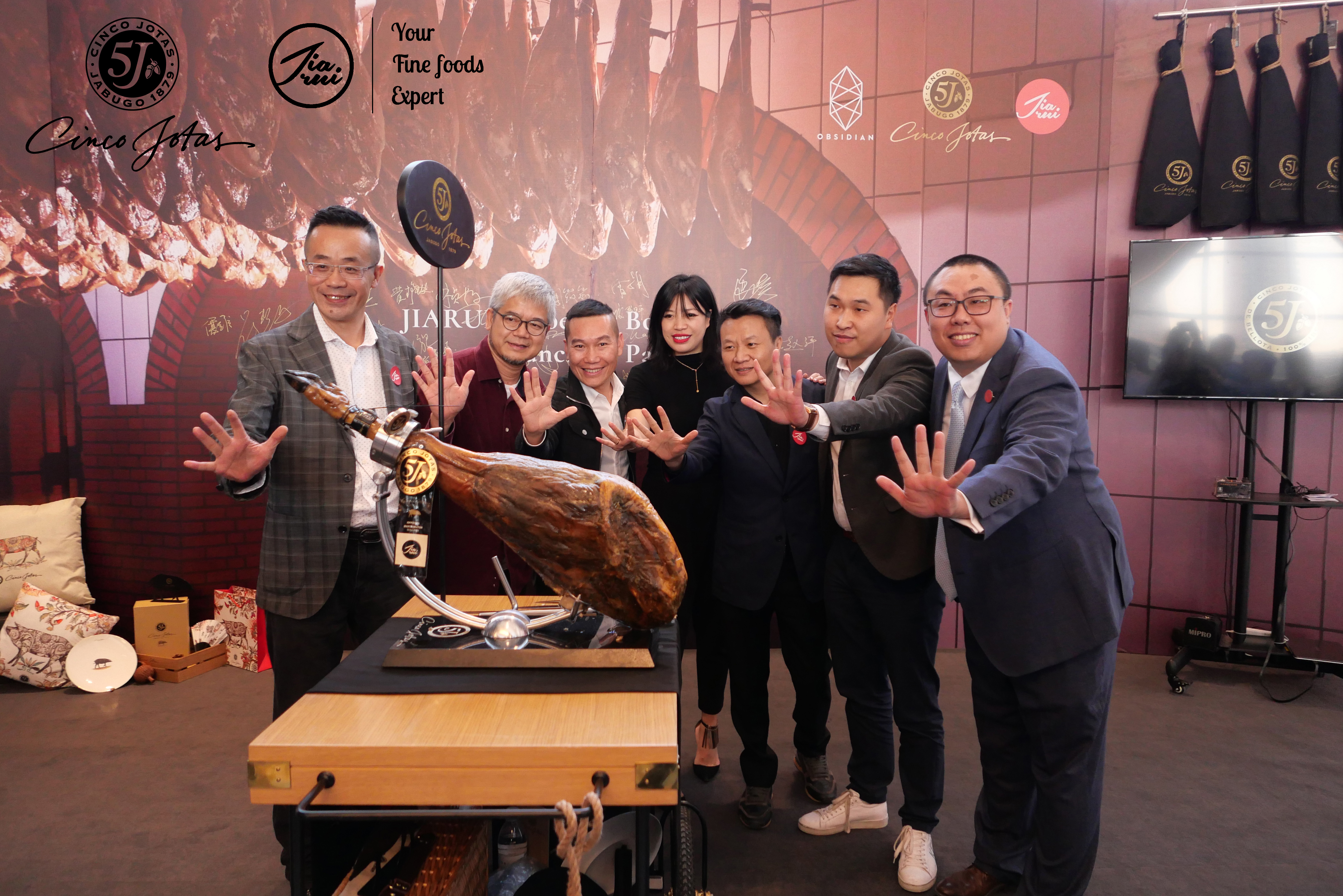 11月28日,深圳佳銳食品有限公司攜手OBSIDIAN BAR和5J品牌在深圳的地標(biāo)-平安金融中心舉行隆重的5j帶骨火腿開關(guān)揭幕儀式;5J的大中華區(qū)銷售總監(jiān)-Selina、深圳佳銳總經(jīng)理-趙斌、OBSIDIAN BAR老板-程子瑞、深圳烹飪協(xié)會-劉永忠副會長、蠔門九式創(chuàng)始人-陳漢宗和潮汕美食達(dá)人-林貞標(biāo)一起為南區(qū)第一條帶骨5j火腿做揭幕。