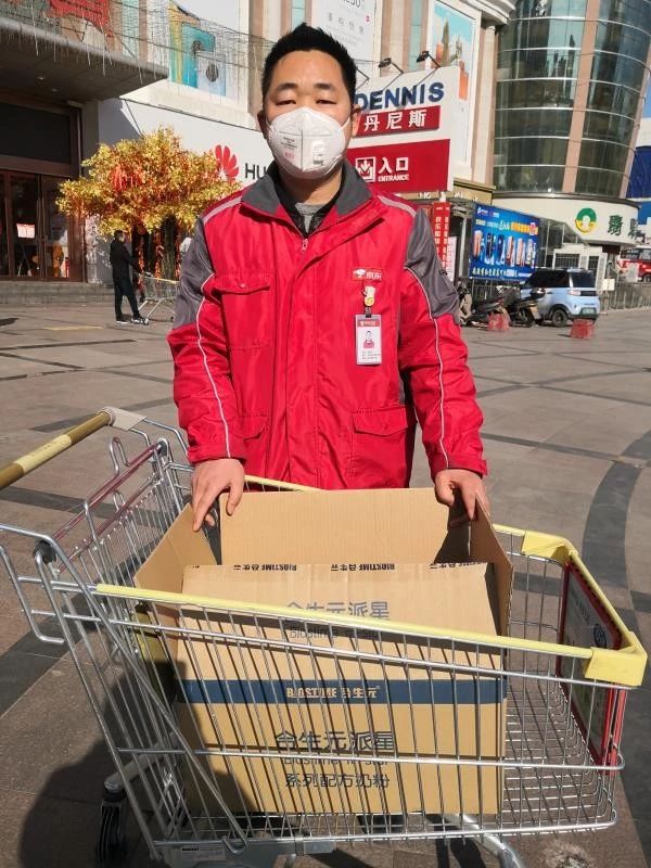 2月14日,京東快遞員在配送合生元產(chǎn)品的路上。