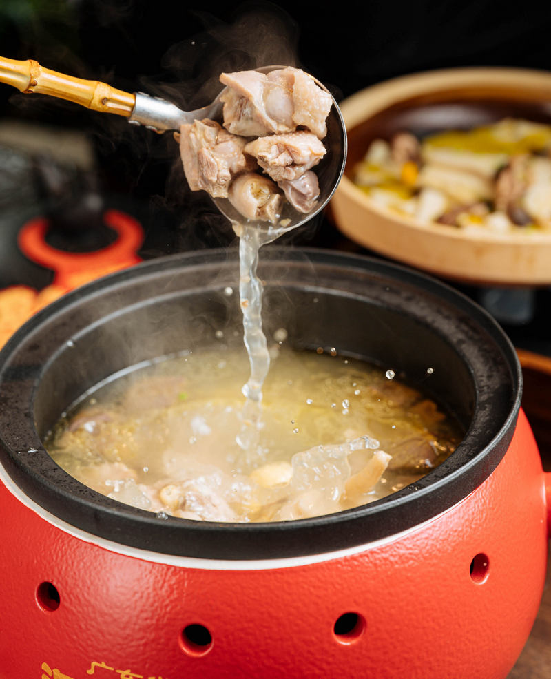 以雞為主要烹飪食材,洞庭土雞館的湖南師傅創(chuàng)造出了不一樣的菜肴。每桌食客坐下,都少不得一碗暖乎乎的洞庭土雞湯來“開場”。它的登場也相當(dāng)有氣勢,長沙紅磚窯特別定制的大湯鍋,內(nèi)膽是紫砂構(gòu)造,這樣的設(shè)計既是出于美觀,又是出于更長時間更有效保溫的效果。俗話說得好,工欲善其事必先利其器。土雞方面,師傅特別精選了湖南竹山雞,肉質(zhì)的彈性略勝一籌,據(jù)介紹,竹山雞的養(yǎng)殖戶開放了大片山頭讓雞跑,放養(yǎng)時間足夠長,達(dá)到一年多,在如今快節(jié)奏的社會里已實(shí)屬難得。老雞加山泉水文火熬3個小時,并沒有其他的味道干擾,簡簡單單就是本味。