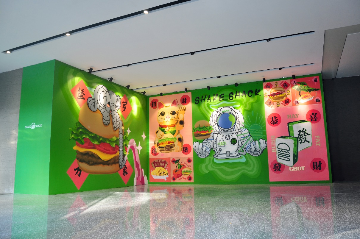 圍擋的室內部分采用創(chuàng)新的互動形式,由藝術家現(xiàn)場親自手繪完成的8幅單元涂鴉畫板組合而成。藝術家用摩登時尚的波譜藝術,向當?shù)刭e客們奉送出中國傳統(tǒng)的祝福及Shake Shack的活力熱情。