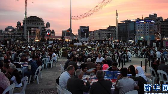 5月16日,在土耳其伊斯坦布爾塔克西姆廣場,民眾在吃晚餐。日落后,伊斯坦布爾各城區(qū)為民眾提供免費(fèi)晚餐,慶祝齋月首日。