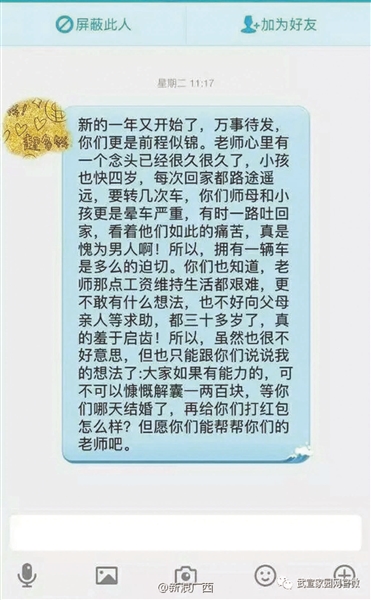 爆料帖中同時上傳了多張聊天記錄,其中一張顯示:“新的一年又開始了,萬事待發(fā),你們更是前程似錦。老師心里有個念頭已經(jīng)很久了,小孩也快四歲了,每次回家都路途遙遠(yuǎn),要轉(zhuǎn)幾次車,你們師母和小孩更是暈車嚴(yán)重,有時一路吐回家,看看他們?nèi)绱送纯?,真是愧為男人啊!所以,擁有一輛車是多么的迫切。你們也知道老師那些工資維持生活都很艱難,更不敢有什么想法,也不好向父母親人求助,都三十多歲了,真的羞于啟齒!所以,雖然也很不好意思,但是也只能跟你們說說我的想法了:大家如果有能力的,可不可以慷慨解囊一兩百塊,等你們哪天結(jié)婚了,再給你們打紅包怎么樣?但愿你們能幫幫你們的老師吧?!?/p>