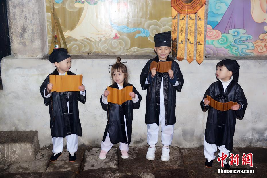 10月16日,在“道教名山”、世界自然遺產(chǎn)地江西上饒三清山,5名來自中外的萌娃身穿統(tǒng)一道服,手持竹簡,在三清宮跟著道教師傅朗讀《道德經(jīng)》、《弟子規(guī)》,學(xué)習(xí)太極拳、書法、古箏等中國傳統(tǒng)文化。這群萌娃中年齡最小的僅11個月,年齡最大也只有6歲。程希雪攝