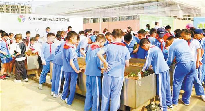 8年來,隨著生態(tài)體驗(yàn)校本課程不斷升級(jí)改造,教學(xué)樓中庭不僅有水稻田,還開發(fā)了蔬果園、野果園、生態(tài)池等體驗(yàn)空間。每個(gè)樓層的走廊上種上了百香果、金銀花等植物,教學(xué)樓的樓頂上也被開發(fā)利用,所種植瓜果蔬菜、花木、中草藥等植物品類達(dá)100多種,建成了一片面積達(dá)8000平方米的學(xué)生體驗(yàn)式實(shí)踐基地,這為孩子們提供了得天獨(dú)厚的體驗(yàn)學(xué)習(xí)空間,使他們能夠親歷種植過程,認(rèn)知生命的成長(zhǎng)規(guī)律,也使得基地四季都能夠服務(wù)于教育教學(xué)。