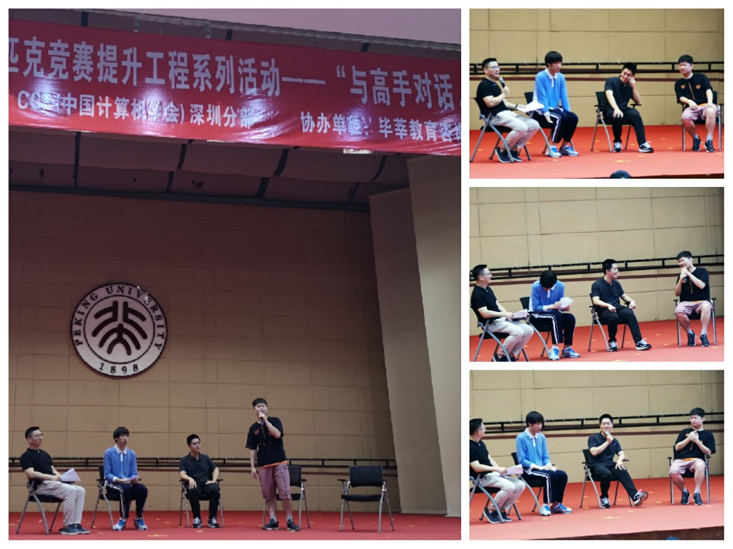 本次活動(dòng)除了邀請(qǐng)周楷文同學(xué)親臨現(xiàn)場(chǎng)之外,還邀請(qǐng)了雅禮中學(xué)正高級(jí)教師,為雅禮貢獻(xiàn)了9塊IOI金牌的朱全民老師;北京大學(xué)深圳研究生院計(jì)算機(jī)專業(yè)雷凱副教授;雅禮中學(xué)畢業(yè),通過信息學(xué)競(jìng)賽保送到北京大學(xué)信息科學(xué)與技術(shù)學(xué)院計(jì)算機(jī)專業(yè)就讀本科以及研究生的章嘉晨同學(xué),國(guó)際大學(xué)生信息學(xué)競(jìng)賽(ICPC)區(qū)域賽金獎(jiǎng)、報(bào)送北京大學(xué)深圳研究生院就讀計(jì)算機(jī)專業(yè)的陳銳彪同學(xué)。