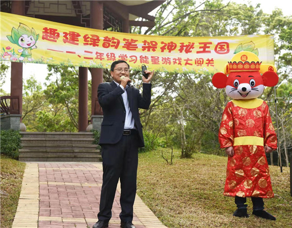 在鳥語相伴下,深圳市學(xué)生文聯(lián)秘書長謝晨的講話拉開本次活動的序幕,他贊揚了華新小學(xué)學(xué)生們學(xué)業(yè)上的優(yōu)秀表現(xiàn),肯定本次活動寓教于自然的教學(xué)方式,也表達了多次參加華新小學(xué)的活動的喜悅之情。隨后,每個年級各準備了兩個節(jié)目為現(xiàn)場帶來歡樂的氣氛,“綠韻筆架?趣建我的學(xué)習(xí)能量王國”活動正式開始,學(xué)生們紛紛往自己年級的活動區(qū)域飛奔而去。