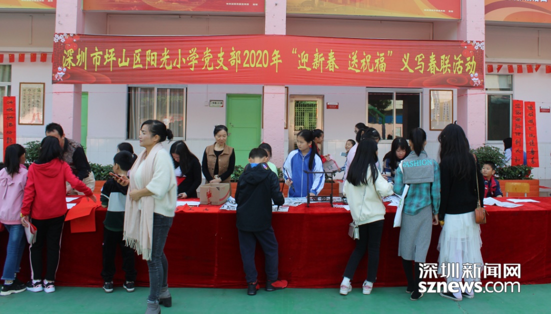 近日,深圳市坪山區(qū)陽光小學(xué)開展“迎新春 送祝?!绷x寫春聯(lián)活動(dòng),老師們現(xiàn)場揮毫?xí)鴮懸桓备痹⒁庑麓鹤85拇郝?lián),為社區(qū)居民、家長奉上美好祝愿。