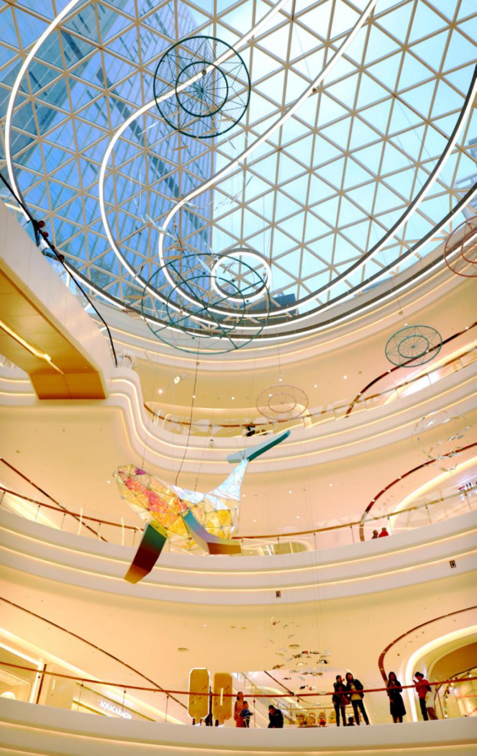 水中庭海之心 LED互動(dòng)地幕秀,隨時(shí)與深海精靈上演親密接觸,內(nèi)設(shè)跨層螺旋星語(yǔ)滑梯,讓人們回歸童年的冒險(xiǎn)世界;木中庭,“凈化”城市呼吸系統(tǒng)的鮮氧氣泡,向下“生長(zhǎng)”的繁茂大樹,如同漫游在森意盎然的自然幻境;花中庭,澆灌“蒲公英”主題跨層挑臺(tái),生長(zhǎng)出城市里的秘密花園。同時(shí),打造玻璃之森、室內(nèi)養(yǎng)魚池兩大自然微景觀,將生態(tài)之靈氣納入方寸之間。