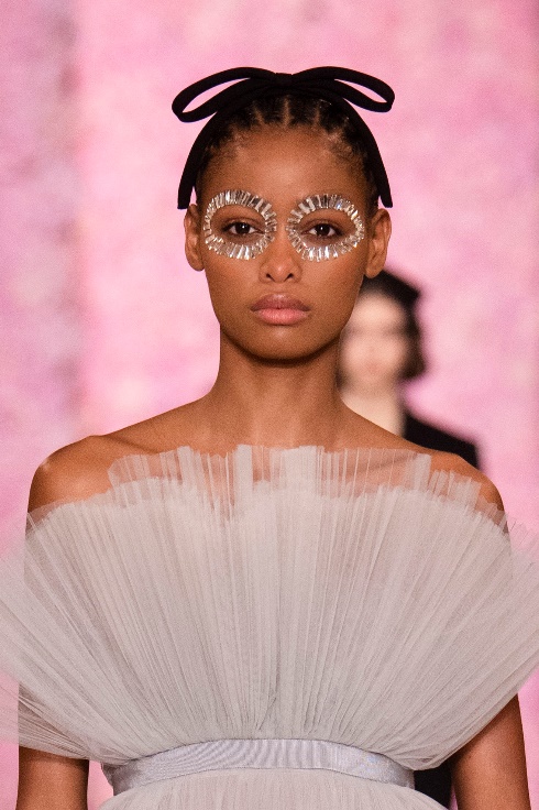 秀場上璀璨奪目的創(chuàng)意水晶元素面部裝飾,均出自化妝師伊莎瑪雅·弗倫奇(Isamaya Ffrench)之手。她選擇了不同尺寸的透明長方平底石和天宇長方平底石,并將它們以畫框的形式點(diǎn)綴在模特眼周,交相輝映出無限純凈光彩。