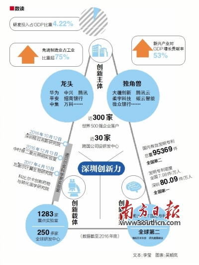 其一,企業(yè)主導(dǎo),政府給力。在整個(gè)創(chuàng)新體系中,企業(yè)是技術(shù)創(chuàng)新主體,代表著市場取向;政府是制度創(chuàng)新的主體,主要任務(wù)是營造良好的創(chuàng)新環(huán)境,彌補(bǔ)市場失靈的不足。只有處理好政府和市場的關(guān)系,才能推動(dòng)整個(gè)創(chuàng)新體系不斷完善。因此,深圳一方面讓企業(yè)唱主角,支持企業(yè)創(chuàng)新創(chuàng)業(yè),華為、中興、騰訊、比亞迪等“龍頭”企業(yè)持續(xù)做大做強(qiáng),大疆創(chuàng)新、光啟、柔宇科技等“獨(dú)角獸”企業(yè)迅速發(fā)展;另一方面,政府從政策和規(guī)劃層面加強(qiáng)創(chuàng)新體系頂層設(shè)計(jì),圍繞科技管理機(jī)制創(chuàng)新、創(chuàng)業(yè)創(chuàng)新能力提升、強(qiáng)化對(duì)外合作等方面構(gòu)建政策支持體系,以企業(yè)為創(chuàng)新驅(qū)動(dòng)核心、以企業(yè)家群體為創(chuàng)新精神內(nèi)核、政策金融人才協(xié)同共生的創(chuàng)新生態(tài)系統(tǒng)加速形成。