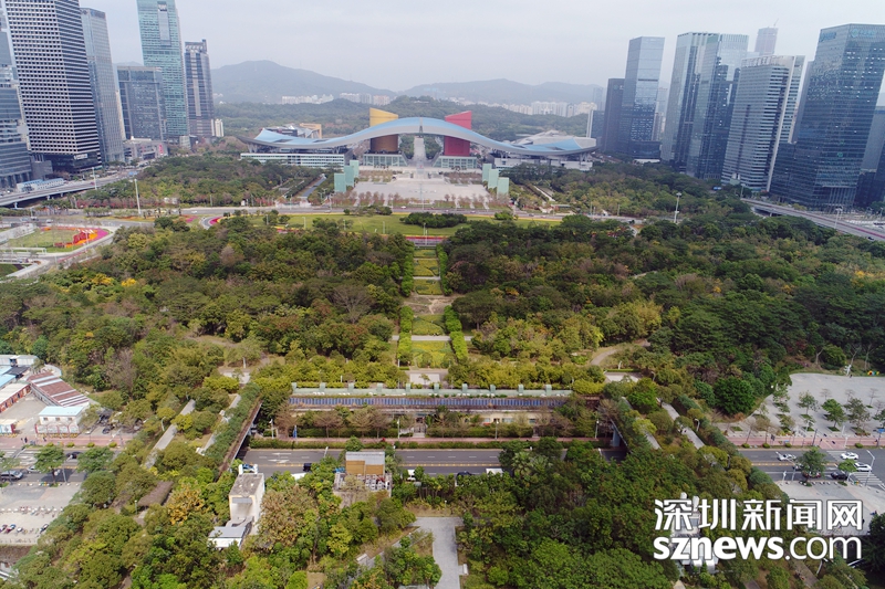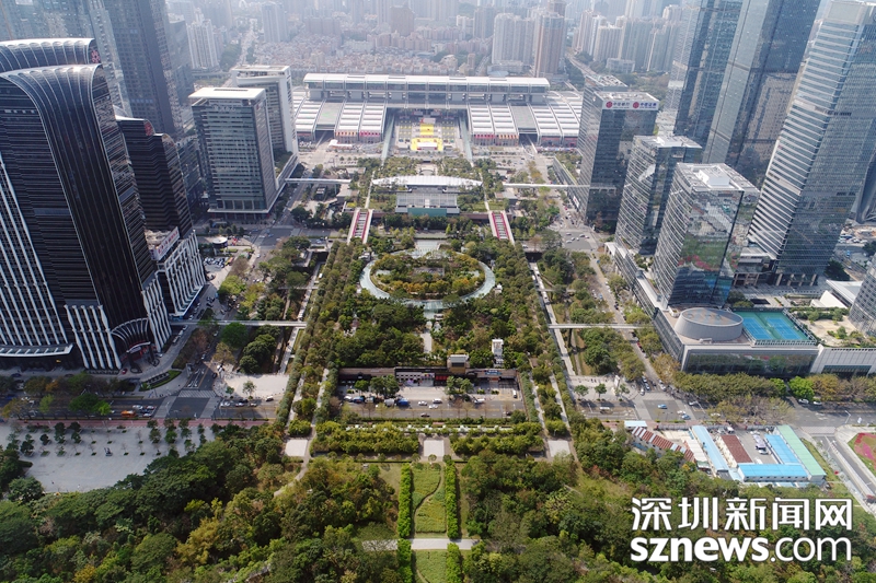 2018年,深圳新聞網(wǎng)無人機(jī)拍攝下的福田中心區(qū)會(huì)展中心附近建筑群及綠地